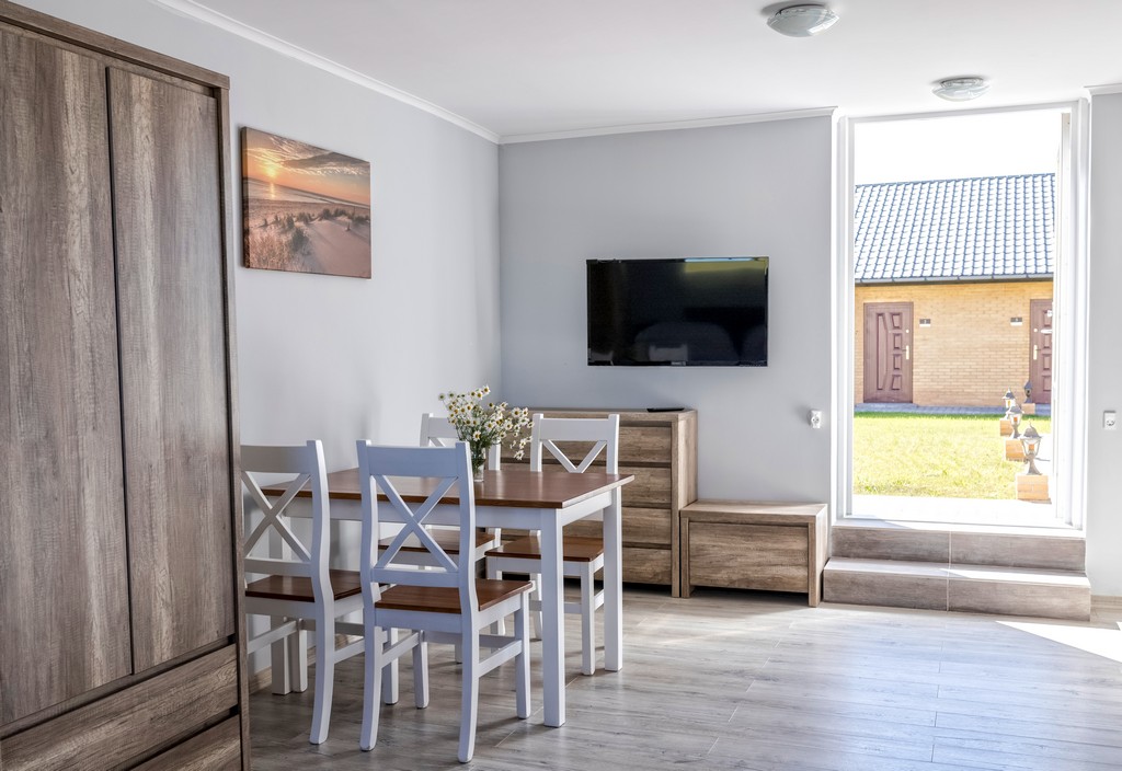Standard „Chaber” to komfortowy 2-pokojowy apartament, z oknami wychodzącymi na patio oraz z drugiej strony na łąkę i bujną zieleń od strony parkingu.