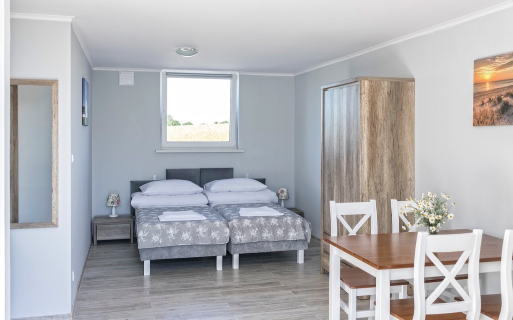 Oferuje w pełni wyposażony aneks kuchenny z wygodnym łóżkiem typu king-size 180 cm (z możliwością rozdzielenia) oraz takie samo łóżko w drugim pokoju. Pościel, ręczniki, mydło, płyn do mycia naczyń wraz z akcesoriami do zmywania są na wyposażeniu pokoju.