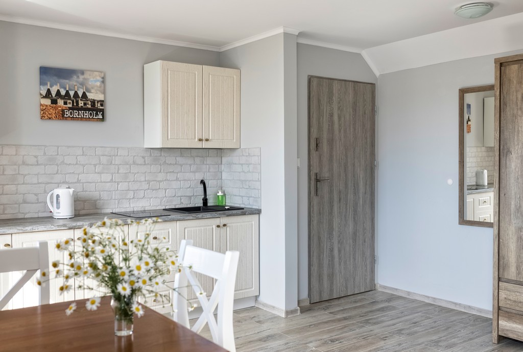 Oferuje w pełni wyposażony aneks kuchenny z wygodnym łóżkiem typu king-size 180 cm (z możliwością rozdzielenia). Pościel, ręczniki, mydło, płyn do mycia naczyń wraz z akcesoriami do zmywania są na wyposażeniu pokoju.